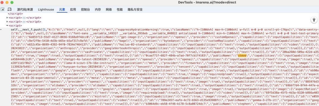 在大模型竞技场的公开页面里,并不能找到steve的身影,不过在前端代码当中,还是能发现有steve的痕迹。