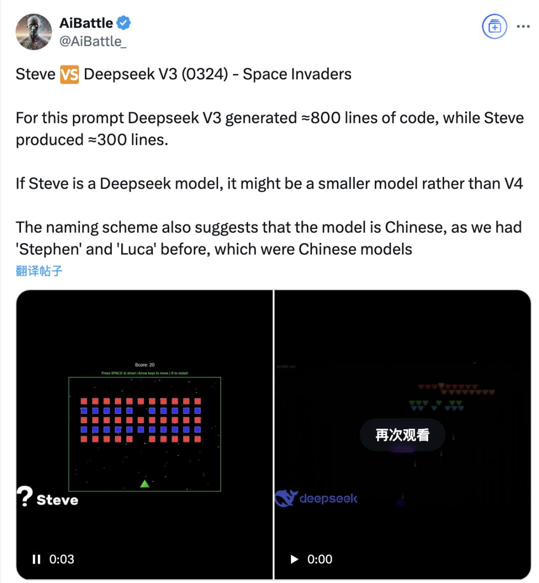 还有人把steve和V3进行了对比,让它们分别编写游戏代码,从长度上看,V3输出了大约800行,而steve只有大概300行。