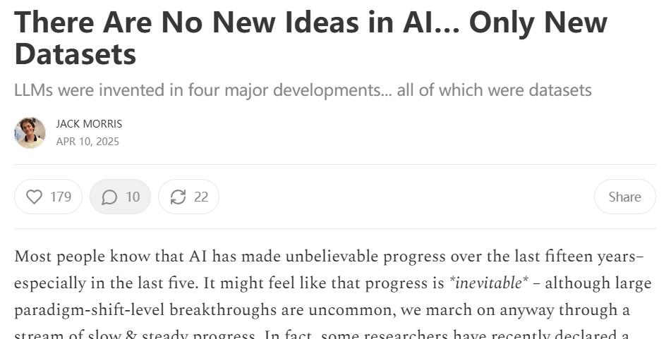 这篇博文的核心意思是:人工智能领域的飞速发展,其核心驱动力并非源于理论的革新,而是对全新数据来源的成功利用。