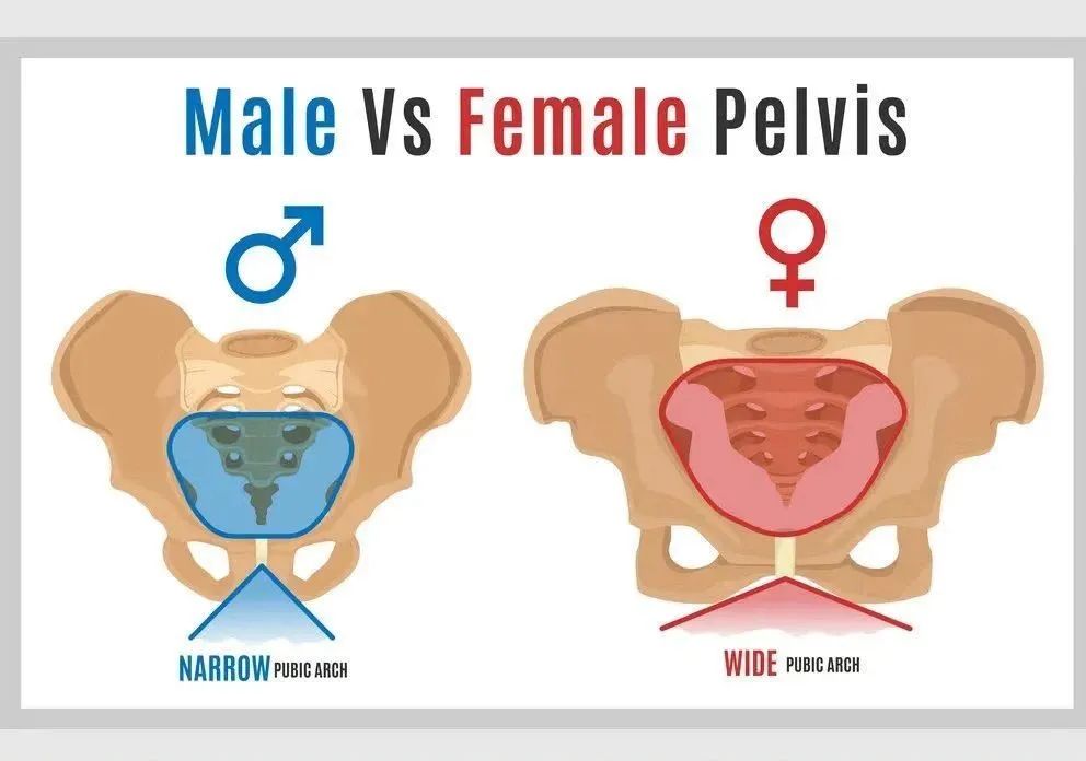 男性和女性的骨盆对比,女性骨盆已经进化到适合分娩的最大宽度,而男性骨盆则针对双足运动进行了优化