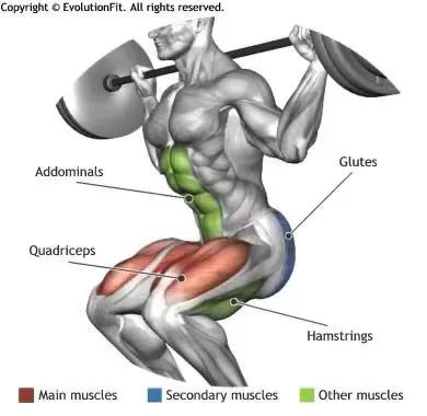 深蹲时锻炼到的肌肉群,红色:主要肌群,蓝色:次要肌群,绿色:其他肌群。其锻炼的肌肉群辐射范围从臀大肌、股四头肌、臀后肌群到臀中/小肌、甚至比目鱼肌和腓肠肌