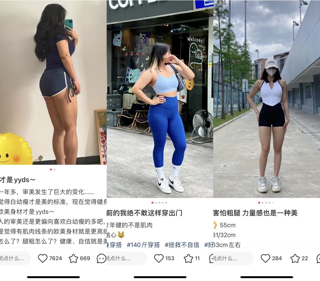 这种现象首先在社交媒体上被反复观察到,小红书女孩开始越来越多无惧于深蹲、硬拉第二天后的步履难行,一双腿部分离度明显,肌肉线条漂亮的腿,在得到越来越多人的喜爱。