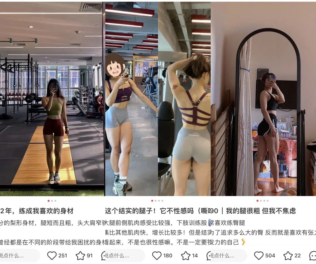 当健身习惯入侵生活,审美趋势逐渐改变,对于部分曾经受腿粗困扰的女生而言,「肉腿」不仅是训练痕迹的勋章,更是从自卑逐渐走向自信的过程。