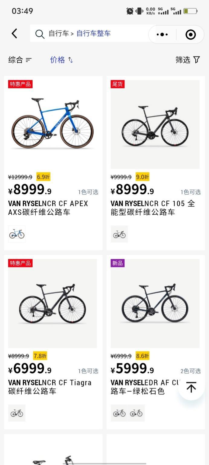 例如,顶奢品牌崔克部分高端车型降幅超过30%;自行车巨头捷安特PCR Ltd2+从6998元直降1400元至5598元,入门款SCR直降800元到3198元;迪卡侬旗下多款公路车也打出6到9折的价格。