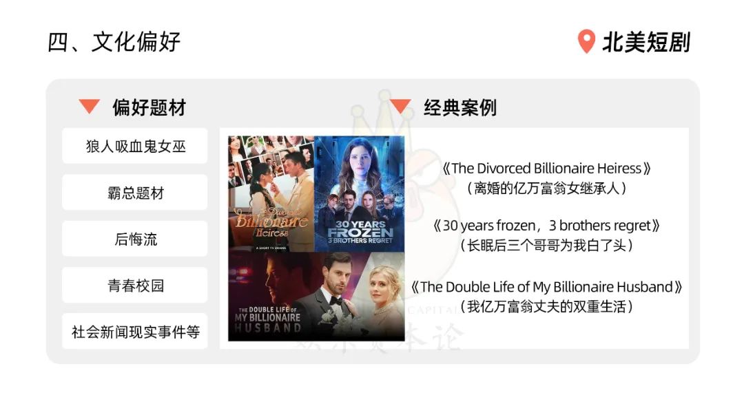 但也有国内爆款很难复制到北美的短剧,比如今年大火的萌宝类短剧,”一是萌宝演员不好找,且美国这边有非常严格的限制未成年参演的法律规定。二是国内很多萌宝题材与玄幻题材相关,但这套神话体系海外用户很难理解。另外,系统、重生类的强设定有理解成本,节奏会比较拉胯。”Chelsea表示。
