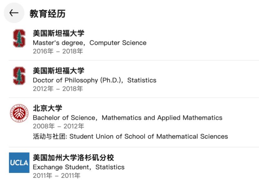 她本科就读于北大,数学与应用数学学士。后进入美国斯坦福大学,读完计算机科学硕士和统计学博士。学生时期有国家开发银行暑期分析师与摩根士丹利暑期副手,以及母校斯坦福研究助理的经历。