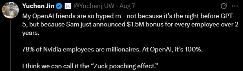 不管怎么样,OpenAI不敢赌。就在GPT-5发布的前一天,Hyperbolic AI CEO 金雨辰(Yuchen Jin)在X上爆料,称在OpenAI工作的朋友告诉他,奥特曼刚刚宣布在 2 年内为每名员工提供 150 (超过1000万人民币)万美元的奖金。