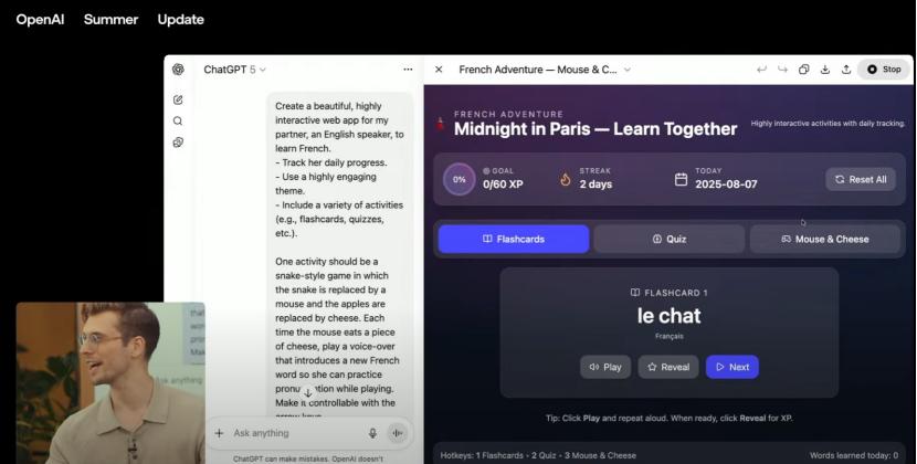 在发布会上,他展示了那个效果非常惊人的编写“多邻国法语学习卡片”的Demo。
