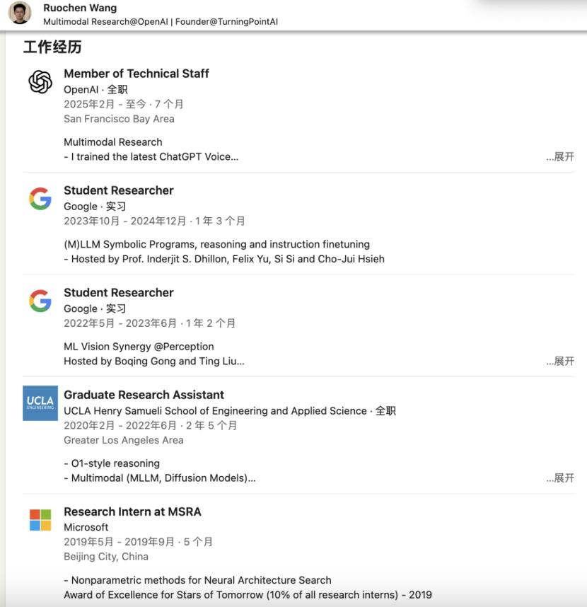 王若宸去年才博士毕业,今年2月才加入OpenAI。在GPT-5发布会上,他代表的是多模态模型团队,ChatGPT最新的语音模式正是出自他之手。早年间他曾短暂就读于上海财经大学,后转学到密歇根大学完成本科学业。其后他进入加州大学洛杉矶分校读完研究生和博士,硕士还曾因为签证问题不得不延期。