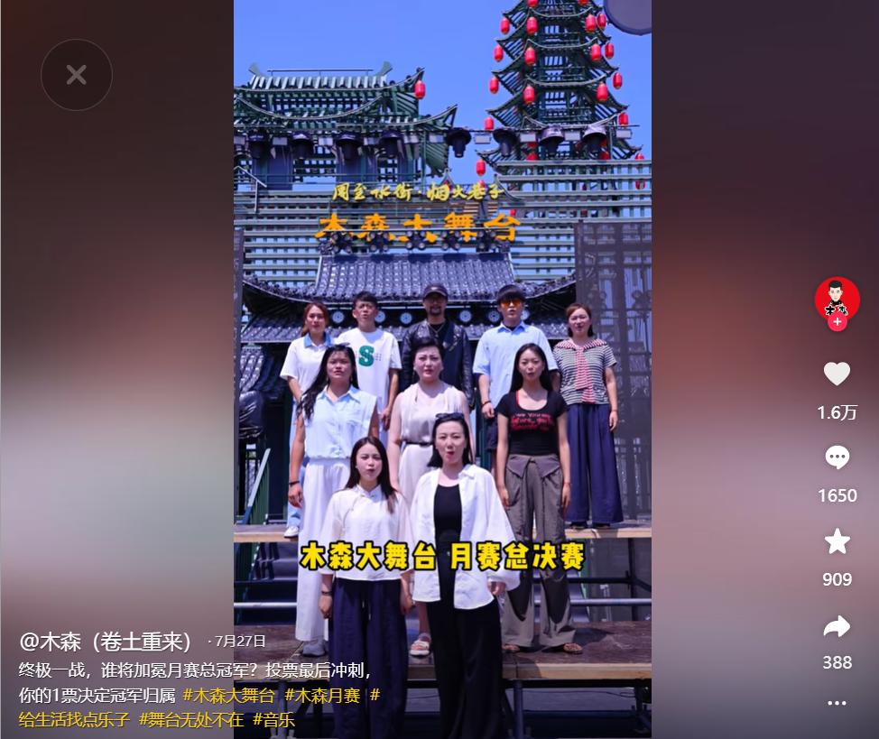 与此同时,也有人把“团播”的形式感发挥到了极致。比如主播木森创办的@木森大舞台,虽然不能算正经的“团播”直播间,但原理上也是在发挥人多的优势,被称作“民间版星光大道”。每晚8点在西安开启3.5小时直播,主打素人才艺PK,包括歌舞、杂技、模仿秀等,算是把东方斯卡拉搬到了短视频平台。