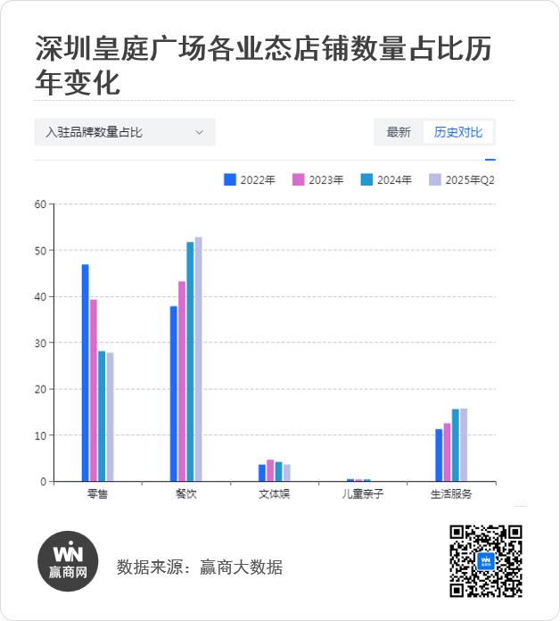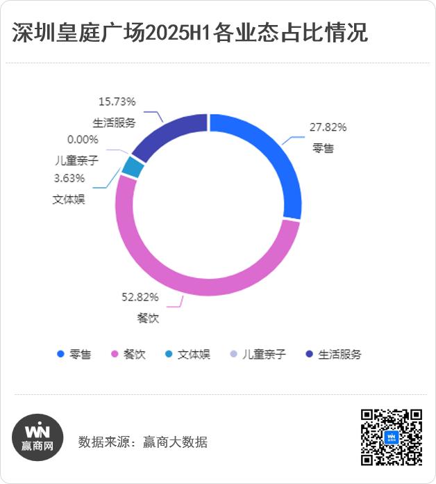 数据显示,从2022年开始,皇庭广场通过不断调整,将餐饮商户占比从38%提升到53%(2025Q2),零售占比从47%降至28%。严重依赖餐饮业态,也造就商场“重餐饮、轻零售”的业态结构,导致整体坪效偏低。