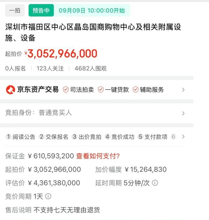 深圳市中级人民法院于8月7日发布公告,将于9月9日在京东法拍平台公开拍卖深圳市福田区中心区晶岛国商购物中心及相关附属设施、设备,起拍价约30.53亿元,对应评估价43.61亿元的7折。此次法拍还需叠加历史债务:截至移送拍卖时,皇庭广场尚欠管理费1631.87万元、水电费740.06万元,均需买受人承担。