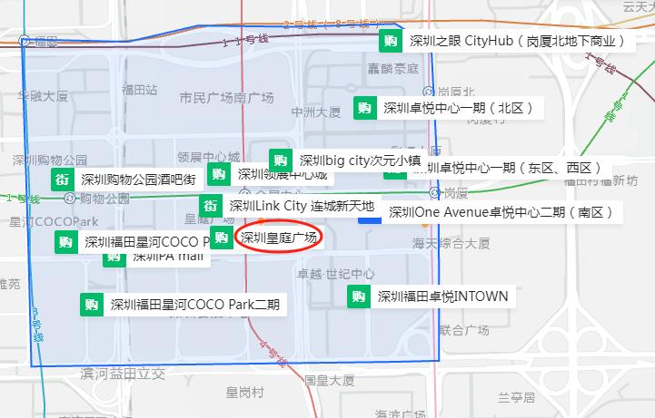 而福田CBD商圈的激烈竞争格局,正在加剧商场“同质化”。数据显示,福田CBD商圈以皇庭广场为轴点,一公里范围里坐落着8座在营商业体,是深圳购物中心聚集度最高的商圈。