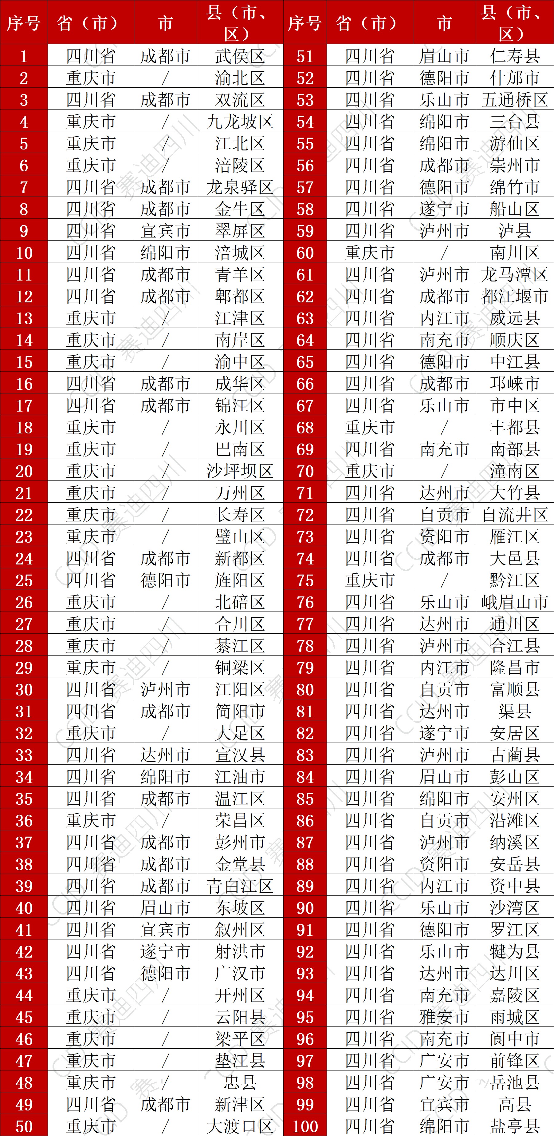 成渝双城经济圈高质量发展百强区县发布,重庆29区县上榜