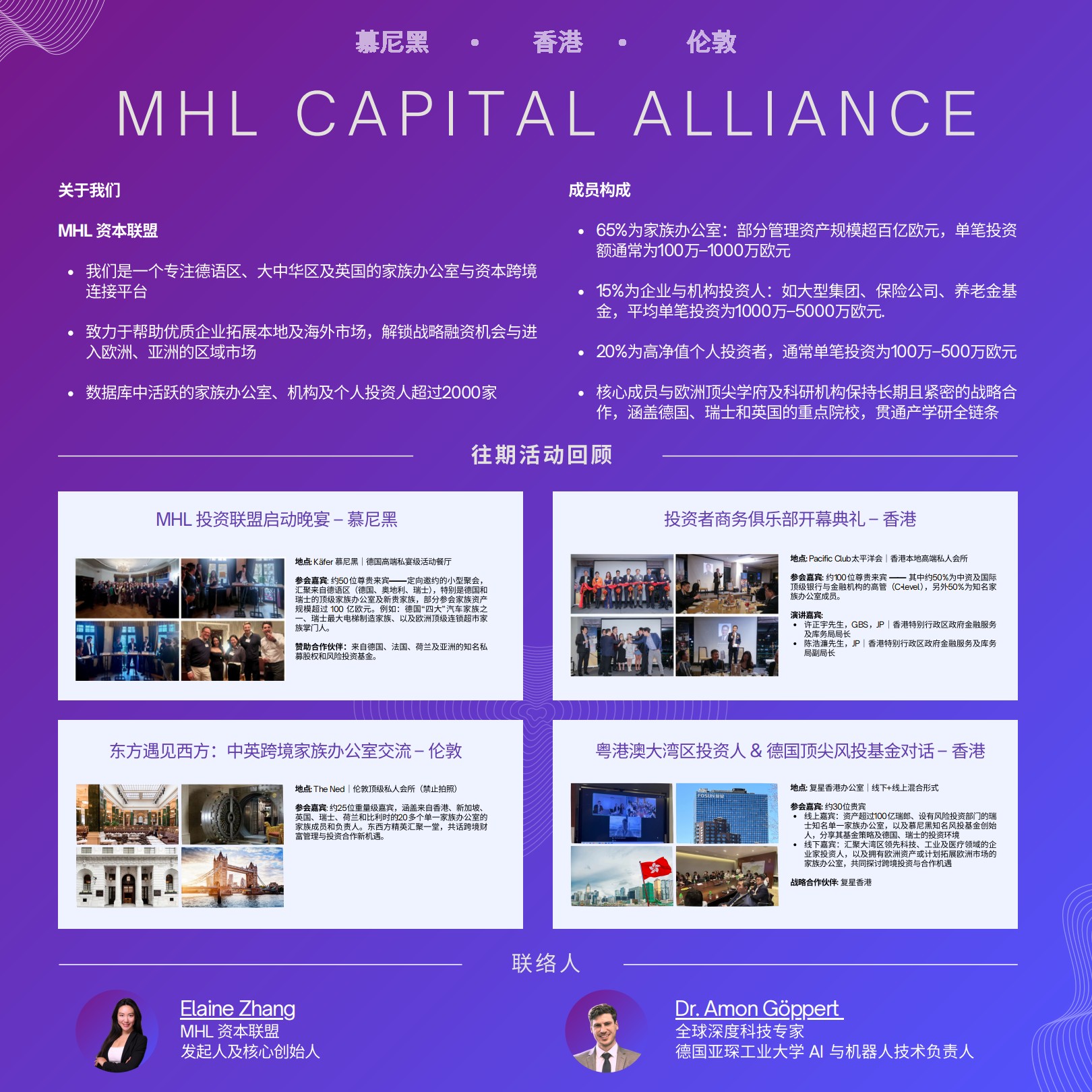 MHL资本联盟是由欧洲与亚洲多家知名家族办公室共同发起的跨境资本与资源平台,聚焦德语区及英国、大中华区市场。致力于帮助优质企业拓展本地及海外市场,解锁战略融资机会并进入欧洲、亚洲的区域市场。