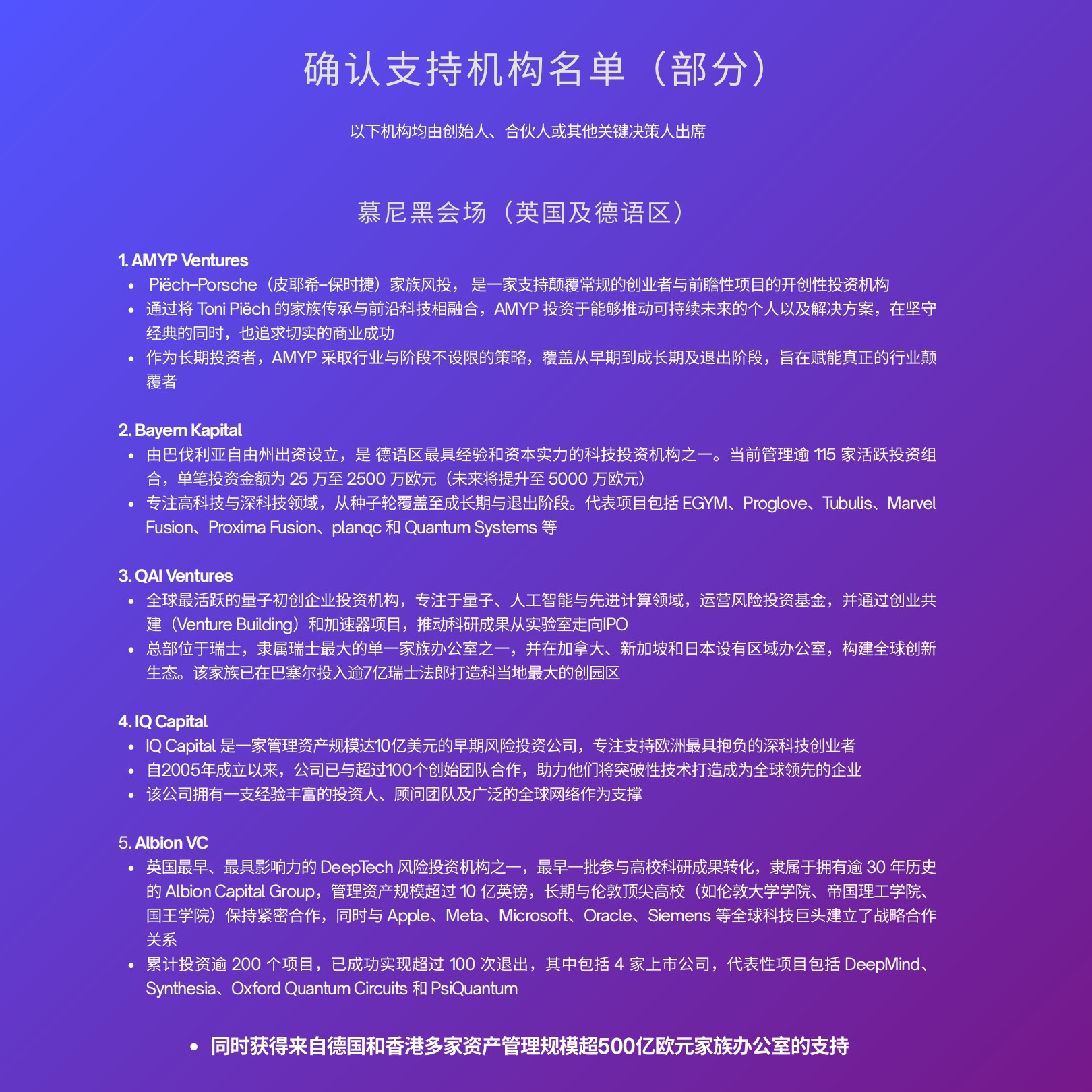 - QAI Ventures:全球最活跃的量子科技投资者,背后由瑞士最大的单一家族办公室之一支持。