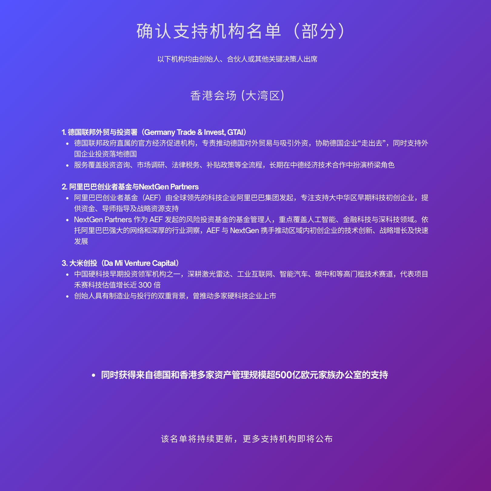 如果你正在寻求融资,并计划在欧洲实现落地,本次活动将成为你通往中德核心资本圈的关键桥梁——也许是今年唯一能在一天内完成这一对接的机会。
