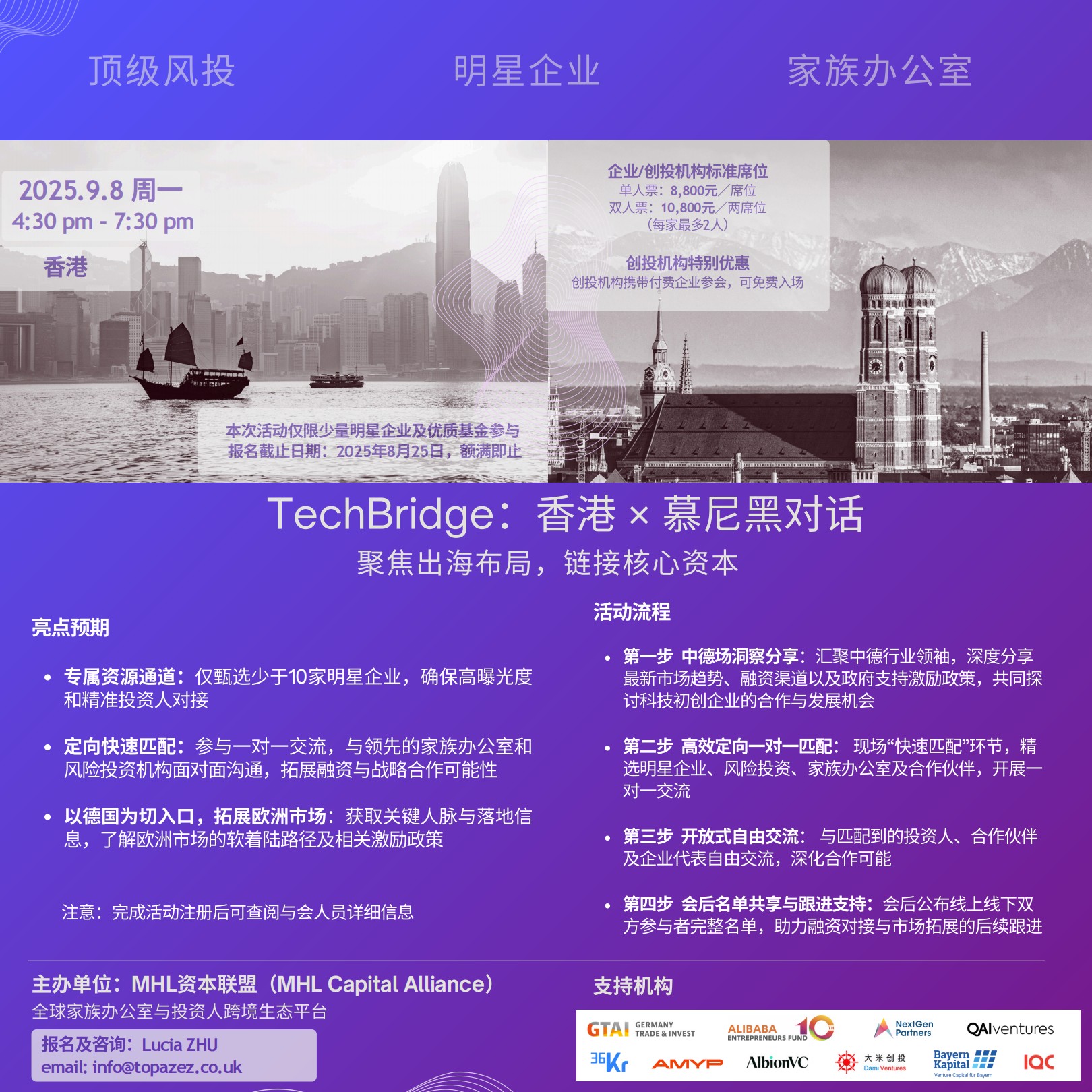 2025年9月8日,TechBridge:香港 × 慕尼黑科技投融资对接会,将用一天时间,为少于10家精选明星企业,打开通往中德核心资本的大门。