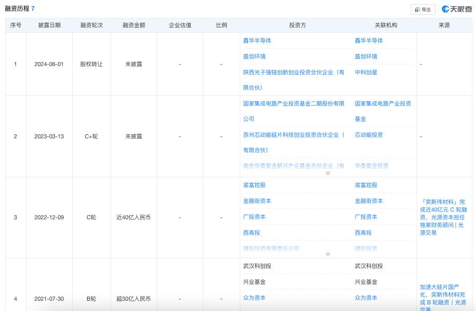 虽然始终处于亏损,但奕斯伟材料一直备受投资机构认可。天眼查显示,自成立以来,公司凭借技术实力与行业地位吸引了7轮资本注入,累计融资超100亿元。