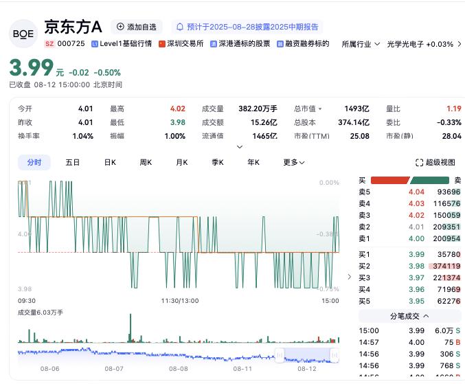 到2017年,京东方实现营业收入938亿元,净利润78.6亿元,同比大增 284.34%,股价涨幅达104%,成功在全球半导体显示领域登顶,王东升也被誉为“中国半导体显示产业之父”。截至2025年8月12日,京东方A报收3.99元/股,总市值1493亿元。
