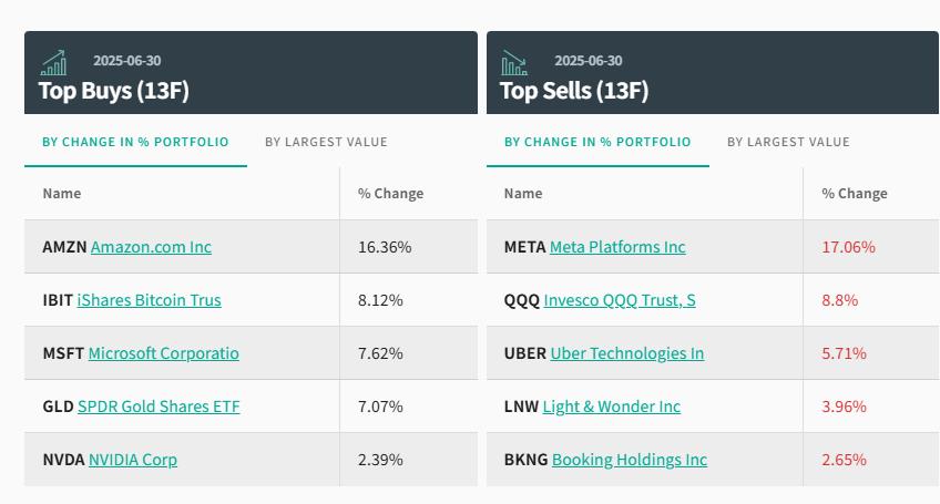 报告显示,第二季哈佛管理公司买入或增持的前五个标的分别为:亚马逊、贝莱德比特币ETF、微软、SPDR黄金信托基金和英伟达,抛售的前五位分别为META、景顺纳斯达克100ETF、UBER、 Light & Wonder Inc和Booking。