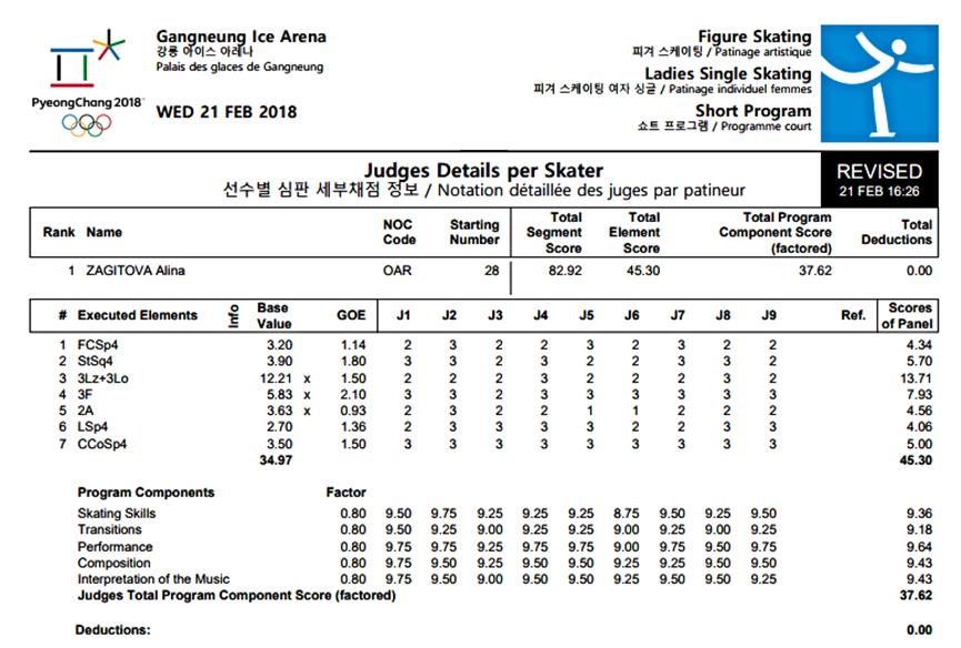 平昌冬奥会女子单人滑短节目项目打分表 图源:知乎