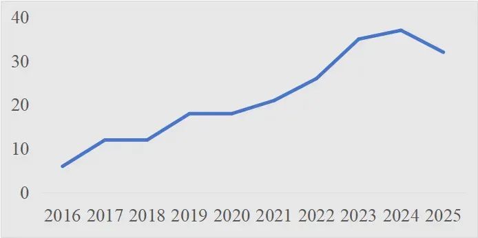 简单举个例子。如果统计下2016年以来,成都市政府工作报告中“消费”这个关键词出现的频次,就能得到下面这张图。可以明显看出,在2021年后,有个明显的上升。