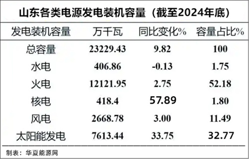 山东省统计局数据显示,截至2024年底,山东全省非化石能源发电装机11559.7万千瓦,占全部发电装机48.3%。其中光伏装机总量约7300万千瓦,占据了绝大大部分。山东省火电装机为12373.4万千瓦,其中绝大部分是煤电,总量超1亿千瓦。