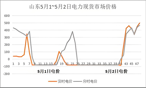 据山东电力交易中心数据,4月29日-5月3日,山东电力现货实时交易累计出现了46次负电价。其中,从5月1日20时至5月2日17时,连续实时现货交易负电价时段长达22个小时。这也使得5月1日全天山东实时现货交易电价均价成为负数,为-13.02元/兆瓦时。
