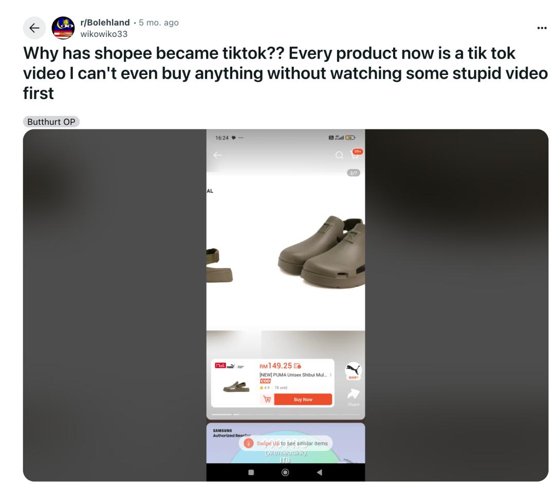 但是正如国内淘宝做短视频和直播电商所遇到的情况一样,很多用户对此并不买账。有用户吐槽:“为什么shopee变成了TikTok?现在所有商品都变成了TikTok视频,我买东西都要先看个傻乎乎的视频。”