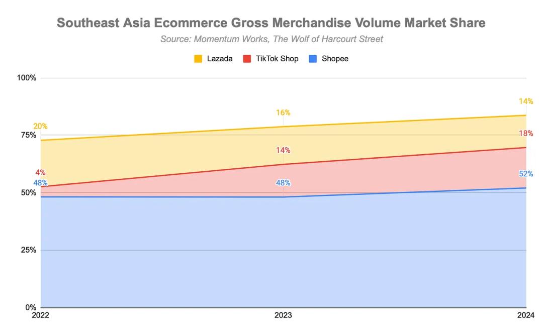 根据 Momentum Works 的《2024 年东南亚电商报告》,Shopee 在 2024 年的电商总交易额(GMV)中占据了 52% 的市场份额,较 2023 年的 48% 有所上升,达到约 668 亿美元 。