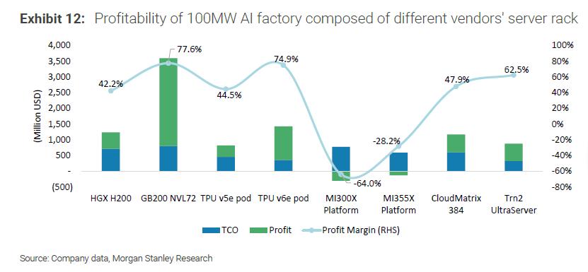 报告最具颠覆性的结论,莫过于AMD在推理场景下的财务表现。大摩测算数据显示,采用其MI300X和MI355X平台的“AI工厂”,利润率分别为-28.2%和-64.0%。
