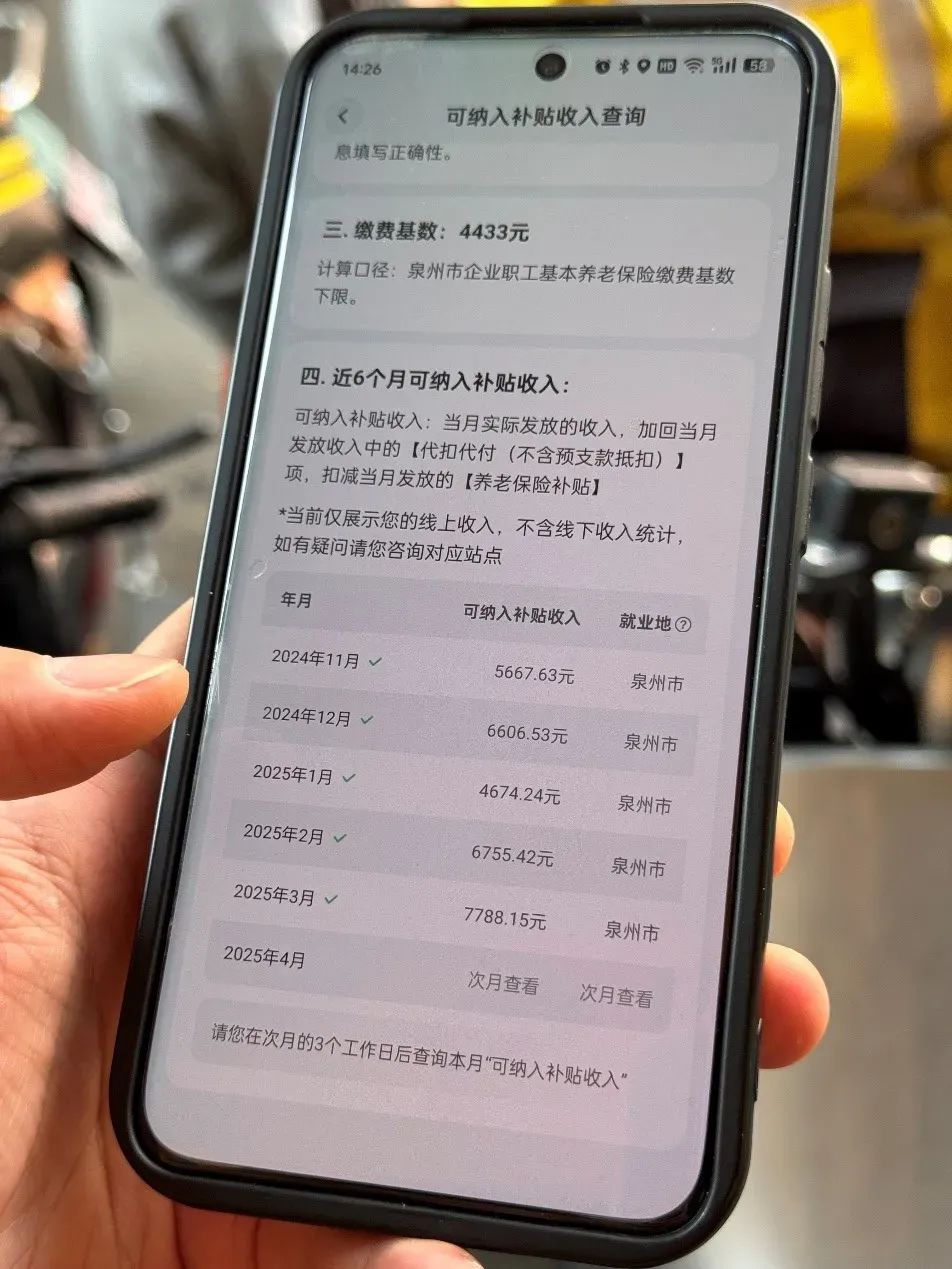 许冉透露,在北上广深一线城市,京东全职外卖骑手人均收入已经接近13000元。根据美团研究院发布的数据,2024年,一线城市的高频熟练骑手月均收入可达到11547元。按月收入5%来计算,近四成骑手能接受的社保月缴费用在577元~650元之间,低于北京、上海等一线城市的社保个人部分最低缴纳标准。相关研究也显示,灵活就业人员工资中位数是社平工资的44.4%,远不及社保缴费基数下限。