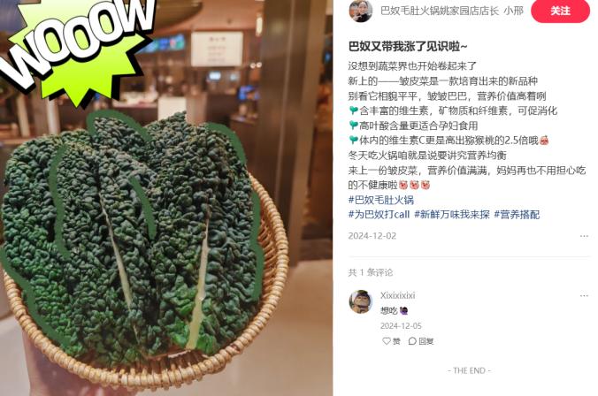 这些火锅店大多强调皱叶甘蓝的营养价值。小红书平台上,多位巴奴店长就曾发布笔记推介门店的皱皮菜,强调皱皮菜的健康养生属性,强化消费者的认知。