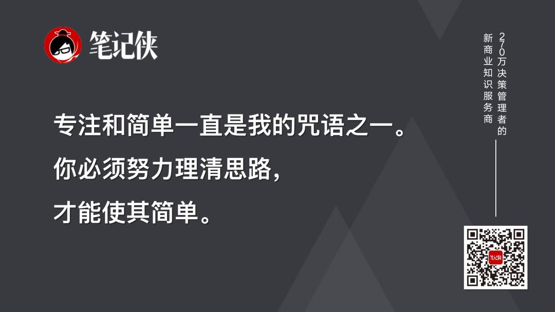 乔布斯说:“专注和简单一直是我的咒语之一。你必须努力理清思路,才能使其简单。但最终这是值得的,因为一旦你做到了,便可以创造奇迹。”