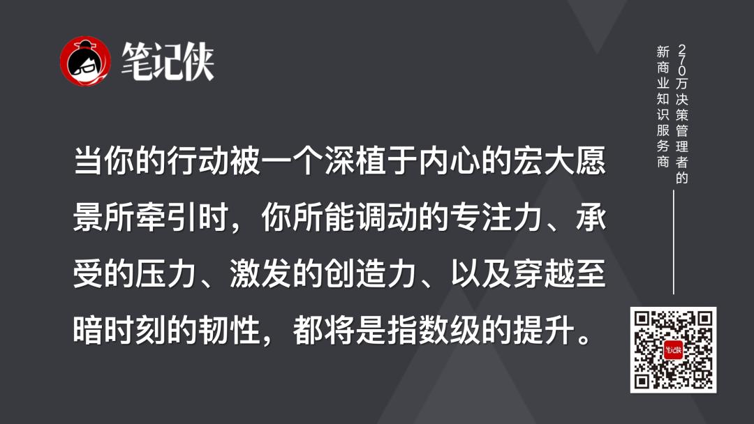 乔布斯和马斯克用他们跌宕起伏却又光芒万丈的人生证明:当你的行动被一个深植于内心的宏大愿景所牵引时,你所能调动的专注力、承受的压力、激发的创造力、以及穿越至暗时刻的韧性,都将是指数级的提升。