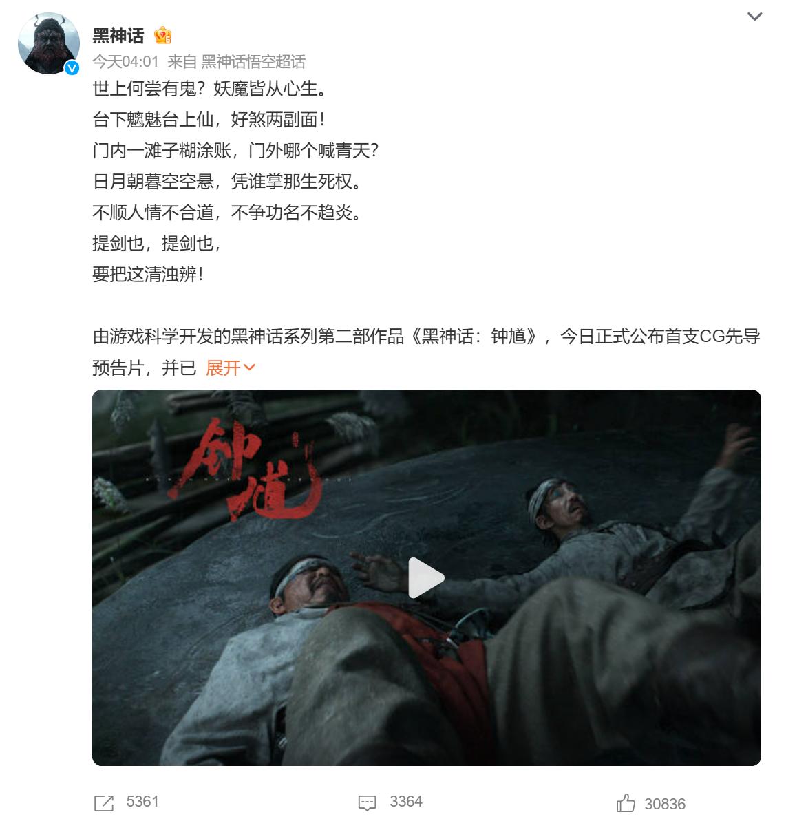 随后,《黑神话:悟空》的官方账号统一更名为「黑神话」,头像换成了游戏中钟馗的形象,官微也第一时间更新了这支CG。