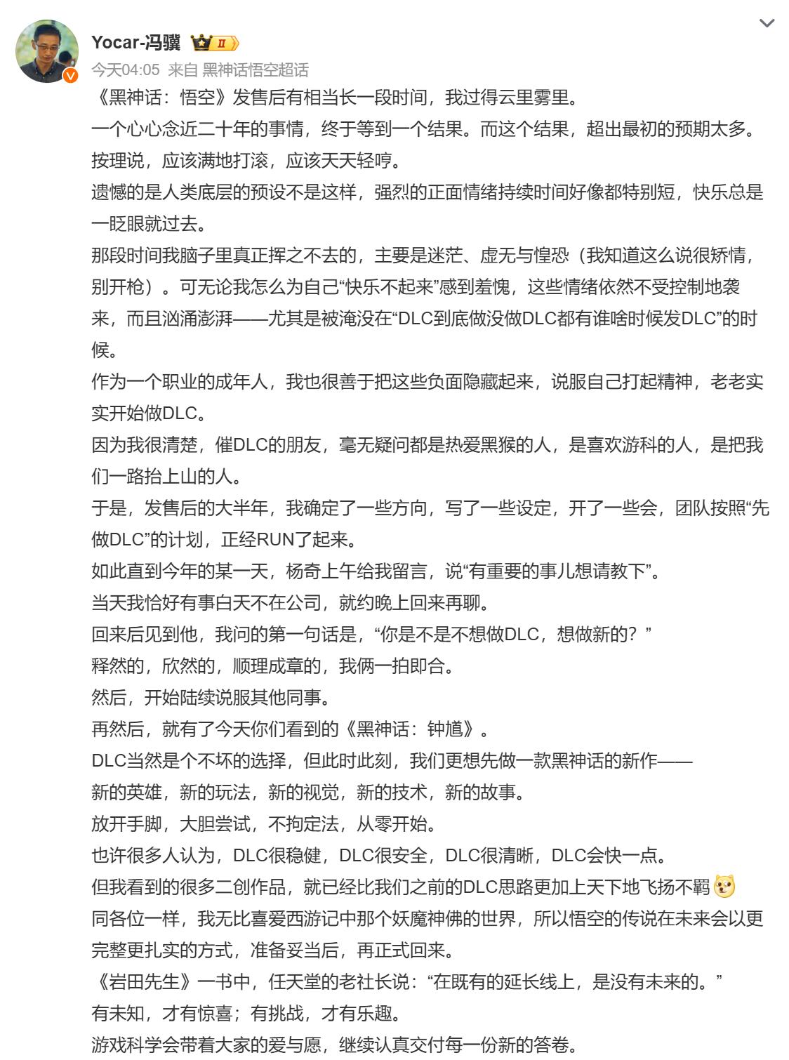 其实,从游戏科学创始人冯骥的微博发言中可以看出,《黑神话:悟空》的成功不仅带来了正面反馈,玩家对DLC的高期待也带来了巨大压力。