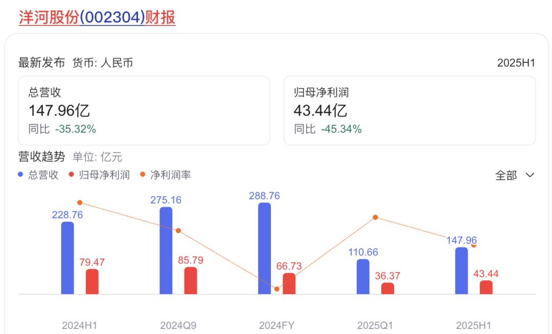 在业绩上,依然延续了此前的下滑趋势。2025年8月18日,洋河股份公布了张联东最后任期的半年财报,营业收入147.96亿元,同比下降35.32%;归母净利润43.44亿元,同比下滑45.34%。营收、利润双双下滑。