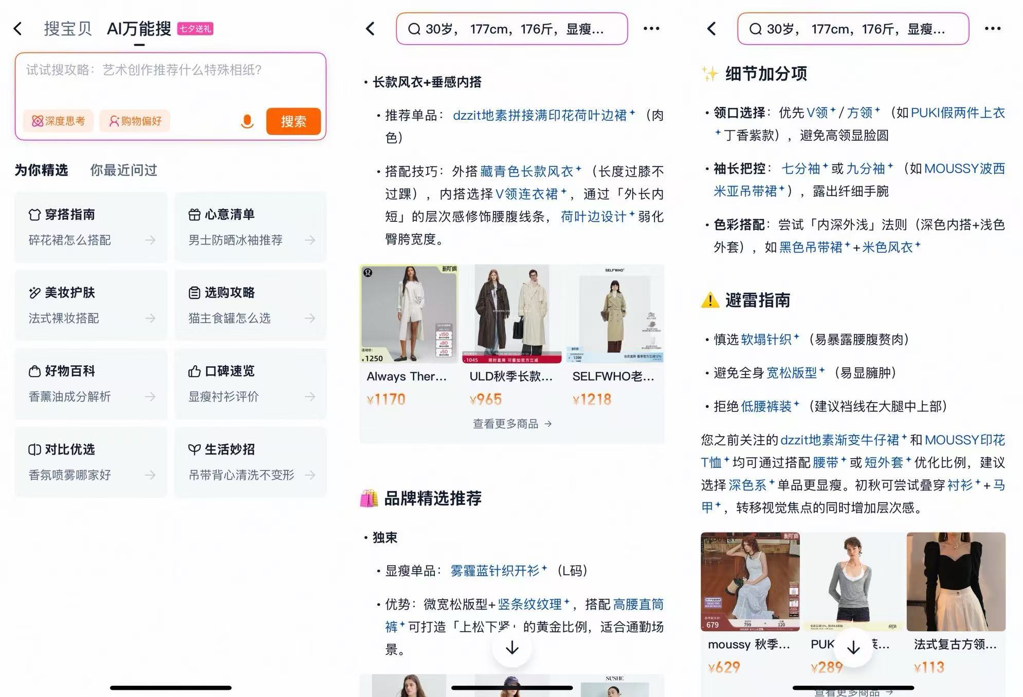 为了提升用户的接受度,“AI万能搜”被设计成与DeepSeek、豆包类似,用获取信息、查询需求、分析总结来向用户展示内容生成的逻辑。此外值得一提的是,“AI万能搜”会基于用户需求和偏好提供解决方案,并给出选购建议和避坑提醒,为用户提供更加个性化、精准的服务。