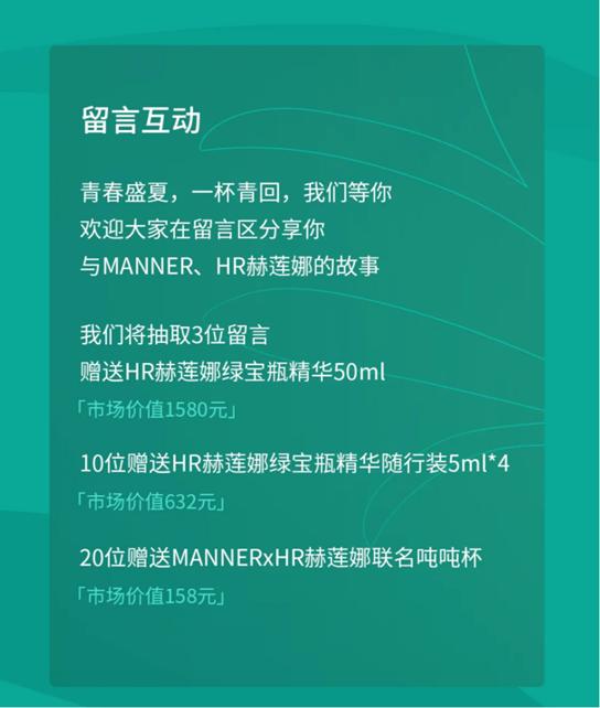 针对此次活动,品牌还设计了购买联名产品领取HR赫莲娜产品小样、主题门店打卡、留言互动等活动,吸引更多消费者体验。有趣的是,MANNER在公众号官宣联名推文中,还标注出了每一个赠品对应的市场价值,似乎是在强调联名产品的“高端奢华感”。