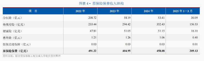据联合资信报告数据,2025年一季度,工银安盛人寿实现原保险保费收入209.13亿元,其中传统寿险、分红险、健康险、意外险、投资连结险收入分别为156.53亿元、36.09亿元、16.10亿元、0.40亿元、0.01亿元,传统寿险和分红险收入分别占比74.8%、17.3%。