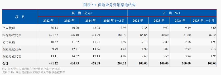 除工银安盛人寿外,中邮人寿2022年~2024年银保渠道的保费收入占比达到96%以上,建信人寿2022年~2025年一季度银保渠道的保费收入占比达到85%以上。