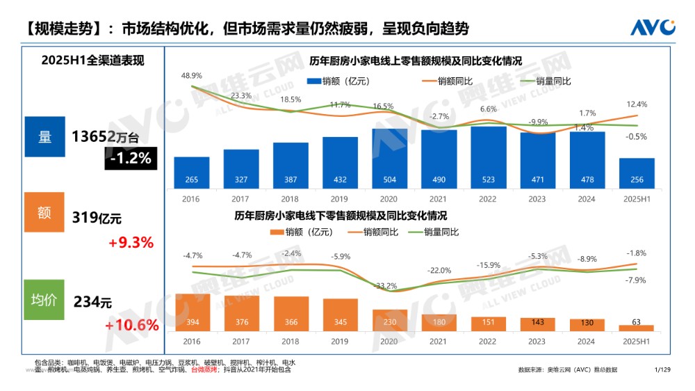 小家电价格降了这么多,销量却没见往上涨。奥维云网最新的半年数据显示,2025 年上半年小家电整体零售量13652万台,同比下降1.2%。另外据奥维云网此前数据,2023年厨房小家电市场整体零售额约为549.3亿元,同比下降9.6%;零售量约为2.65亿台,同比下降1.8%。2024年“618”促销期,厨房小家电全品类线上渠道(传统电商+抖音)零售额为32.8亿元,同比下降10.3%。