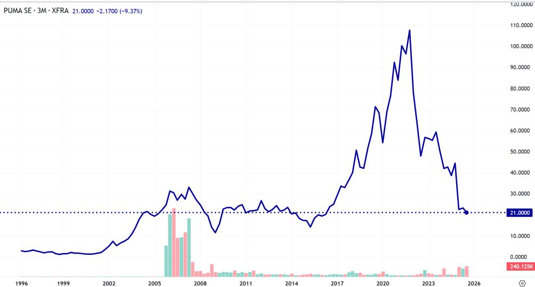 就连一些关键数据都像是回到10年前。就在上周,彪马股价曾跌至17欧元,创2016年以来新低。