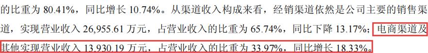 不过,作为主要销售渠道的经销渠道,营业收入为2.7亿元,占营业收入的比重为65.74%,同比下降13.17%。
