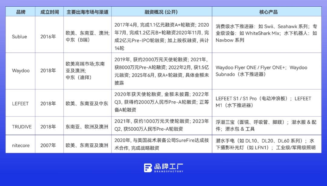 正如开头提到的,当前,中国潜水设备企业正在逐步改写行业市场格局,其中出海就是重要的部分,为此,品牌工厂整理了5家在出海方面崭露头角的国内品牌,从它们的成立时间、主要出海市场与渠道,融资概况、核心产品等方面进行了梳理。