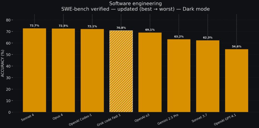 据 xAI 称,他们采取整体方法进行模型性能评估,并将公共基准测试与实践测试相结合。在 SWE-Bench-Verified 的完整子集上,Grok Code Fast 1 使用自己的内部测试工具获得了 70.8% 得分。
