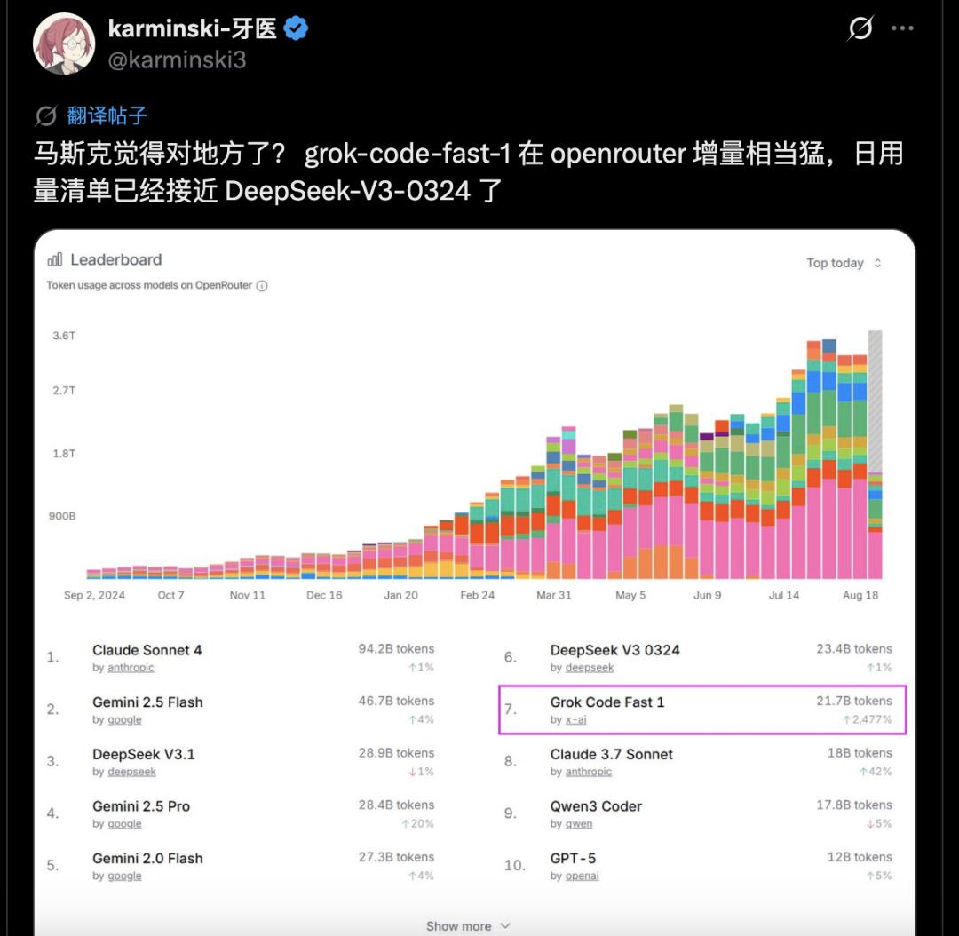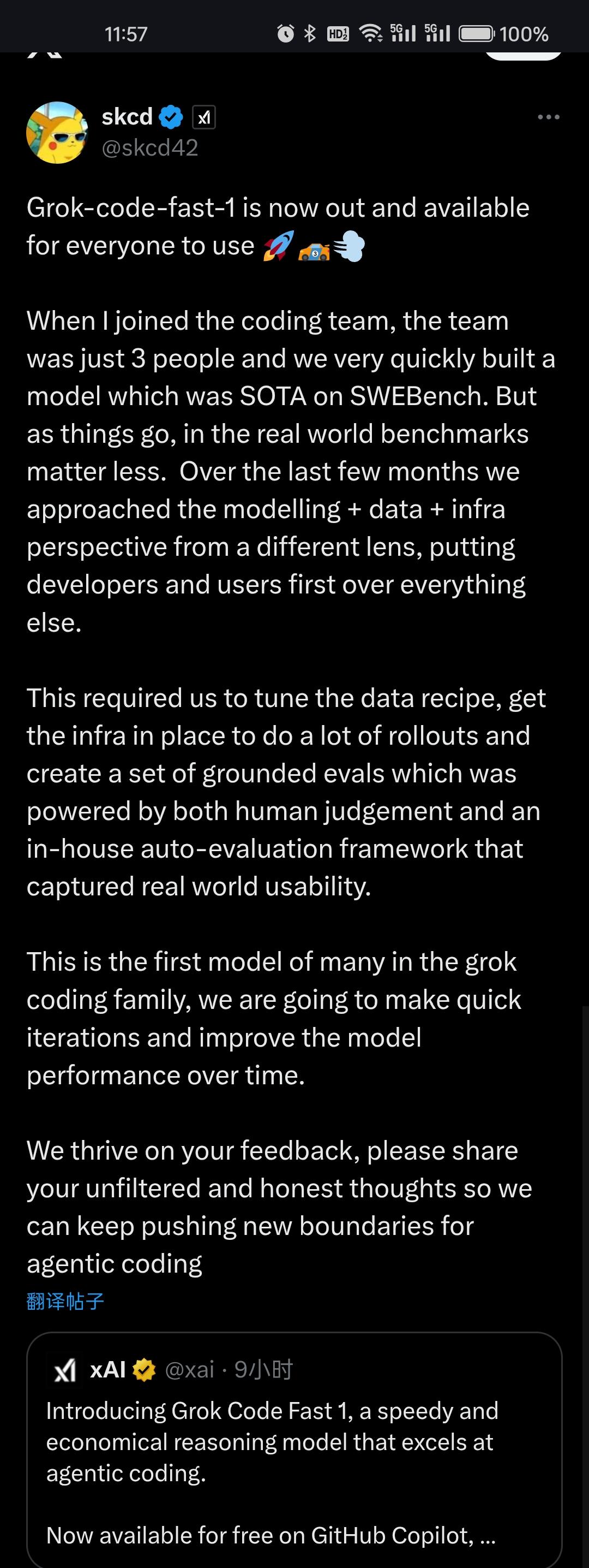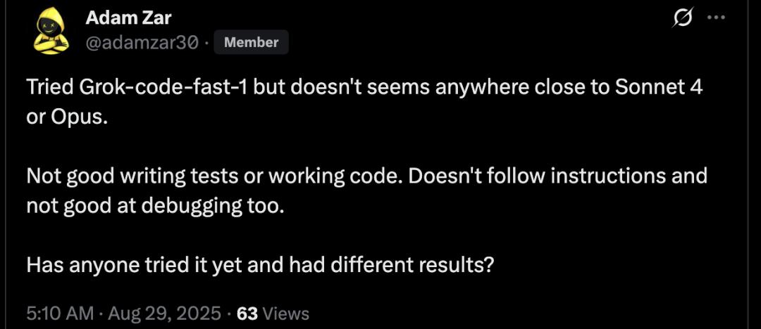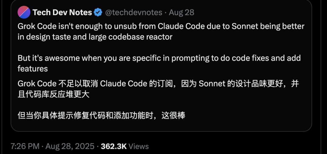 同时,还有用户尝试过 Grok Code Fast 1 后表示似乎与 Sonnet 4 或 Opus 相差甚远。
