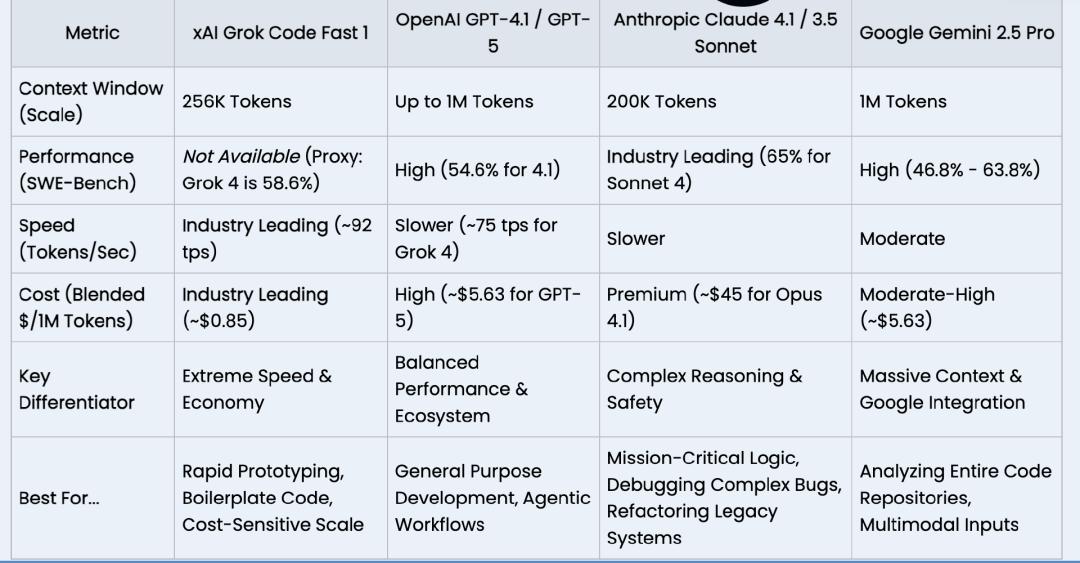 为此,以下矩阵提供了 Grok Code Fast 1 与其主要竞争对手 OpenAI、Anthropic 和 Google 的战略性、一目了然的比较,重点关注对商业和技术领导者最重要的指标。